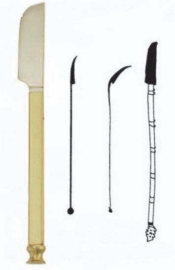 Resmine dayanarak modelimizi imal ettiğimiz Ḫalīfe, el-Kāfī’sinde şöyle demektedir: Bu alet deri altındaki şişkinliği yarmakta ve kesip almaktadır. Mersin ağacı yaprağı buna gerek bırakmamaktadır.